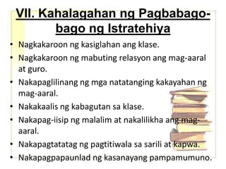 3 aaral Angkop sa aralin 4 fKatangian ng Mabuting Istratehiya 1 Simple at madaling maisagawa 2 Nagsasangkot sa lahat ng mag-aaral 3 Nagbibigay ng mabuting bunga Nakatutulong sa paglinang ng 4 maraming kakayahan ng mag-aaral Humahamon sa kakayahan ng 5 mag-aaral Higit na marami ang gawain ng mag- 6 aaral kaysa guro f Mag-aaral na concrete Pair work. Nagbabasa para matuto 6. Ang mga estudyanteng ito ay natural na nakakaakit sa mga guro at mahirap na hindi yakapin ang mga ito dahil ginagawa nila ang iyong trabaho na mas madali.