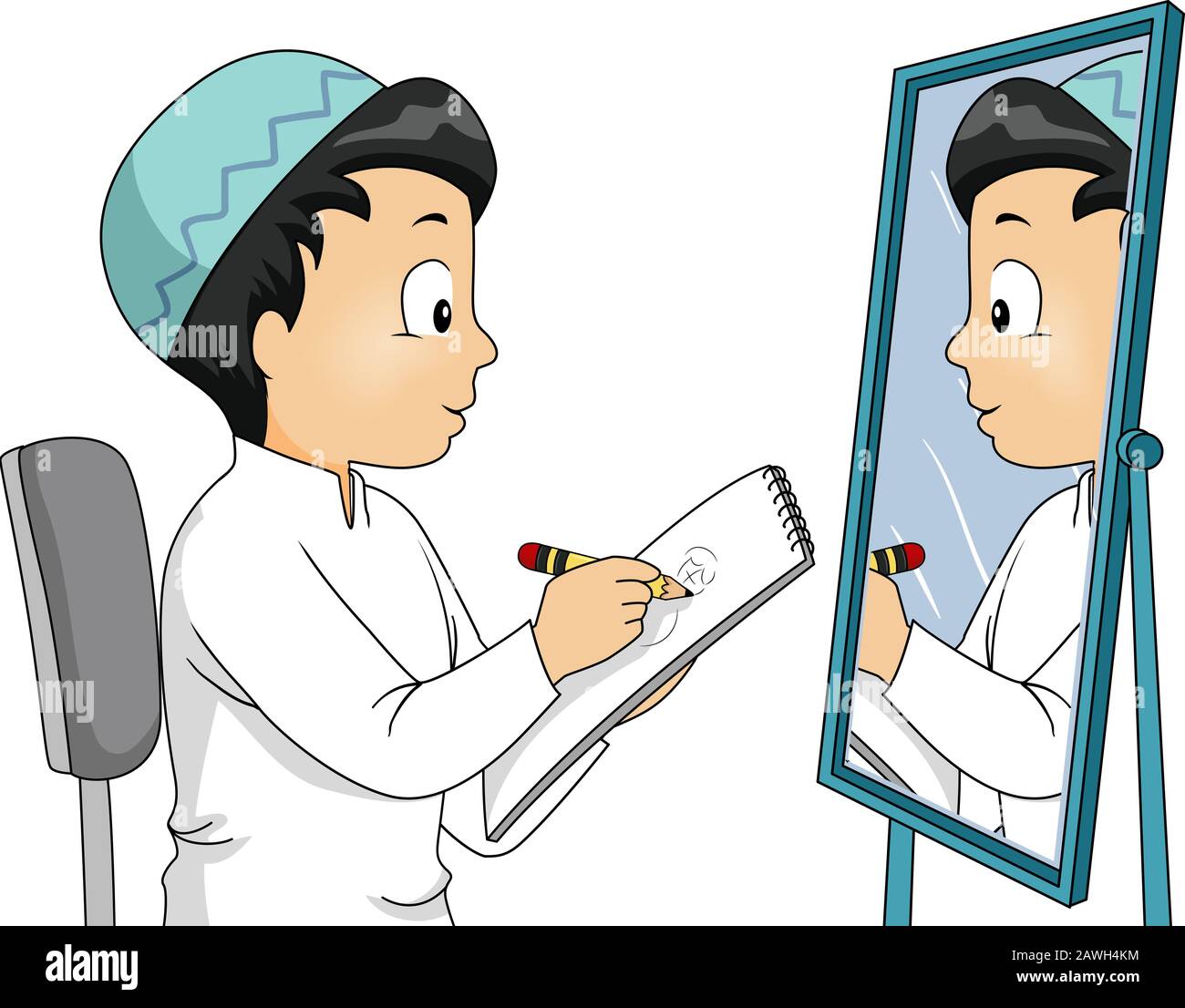 Illustration Of A Muslim Kid Boy Drawing His Face On Paper Using Pencil And Looking In The Mirror Stock Photo Alamy