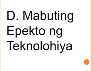 Magandang naidudulot ng teknolohiya. Sa pormal na paraan ang pag-aaral ay nagaganap sa loob ng paaralan. Maraming magandang naidudulot sa pamumuhay ng tao ang mga makabagong. Maraming mga pakinabang ang naidudulot ng teknolohiya para sa bawat isa sa atin.
