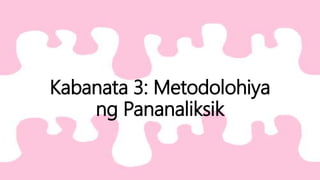 ANG METODOLOHIYA SA PANANALIKSIK Angmetodolohiya ay kalipunan ng pamamaraan o metodo na gagamitin o ginagamit ng mananaliksik upang maisakatuparan ang ginagawang pag-aaral. Kuwentong-Buhay - kilalarin sa tawag na narrative inquiry at maaring tumukoy sa espesipikong metodo ma ginagamit sa imbestigasyon ng isang penomenon. Internet 5Talatanungan o Kwestyoner.