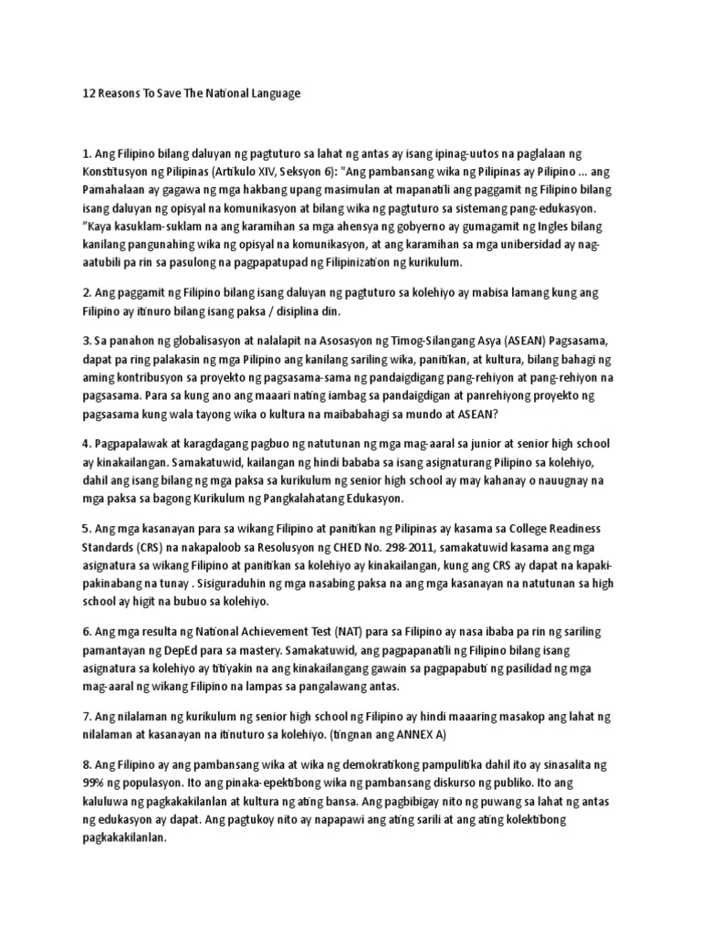 Menchu Dela Cruz Guro sa Filipino II Punong-guro Ika- 12 ng Pebrero 2016 fDAHON NG PAGPAPATIBAY Ang pag-aaral na ito na may pamagat na Kahalagahan ng asignaturang Filipino sa Kolehiyo ay iniharap at inihanda ng mga mag-aaral na sina Albao Ronald Guilaran Rema Salonga Jovi Lloyd C Santiago Franco NiƱo R Tseng Shawnjojo i. These were transferred to the Senior High School level since these are important building blocks in the preparation of senior high students to be university-ready when they graduate aniya.