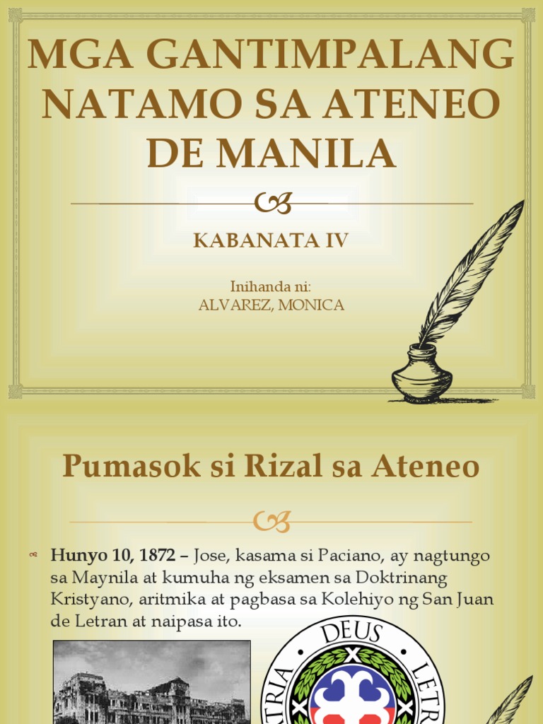 Pg aaral n jose rizal sa ateneo d municipal. ANG PAG-AARAL NI JOSE RIZAL SA Ateneo Municipal de Manila ANG MGA HESWITA ng Society of Jesus ay. Rizal Mi Piden Versos ang nagawa niyang tula at binasa ang tulang ito sa pagdiriwang ng samahan sa bisperas ng bagong taon noong 1882. Nagsimula ang pag-aaral sa taong iyon.