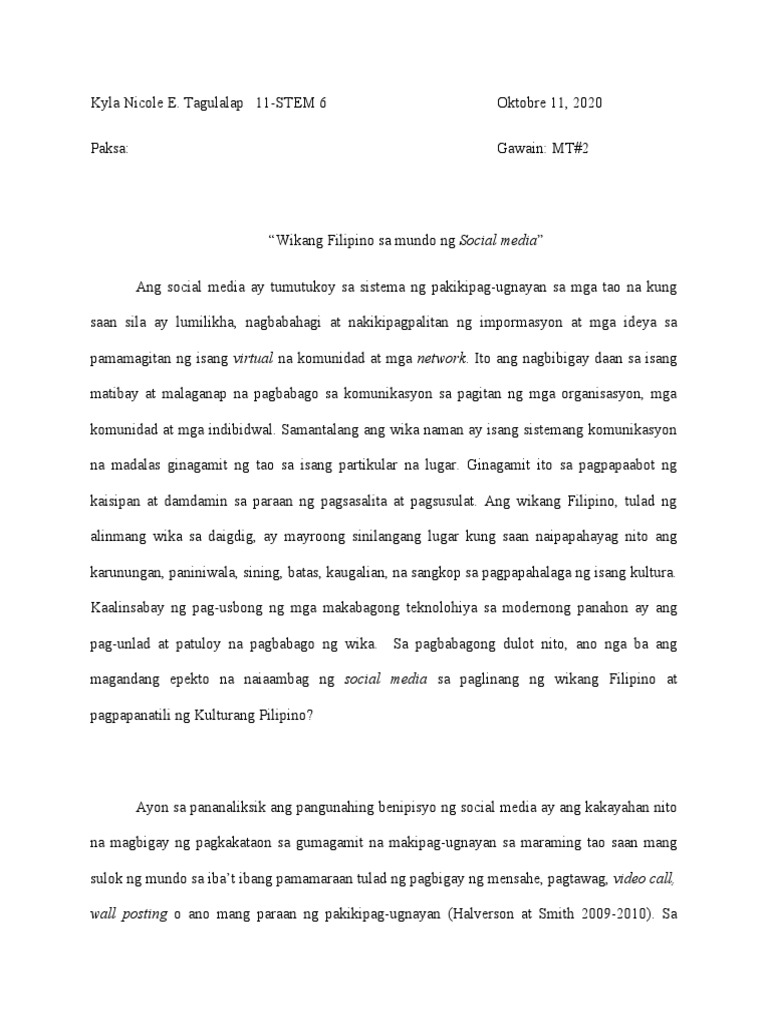 Pt Sanaysay Stem 4 Tagulalap Docx Kyla Nicole E Tagulalap 11 Stem 6 Paksa Kasaysayan Ng Wika Nobyembre 6 2020 Gawain Pagsulat Ng Burador Mt 2 Tema Course Hero