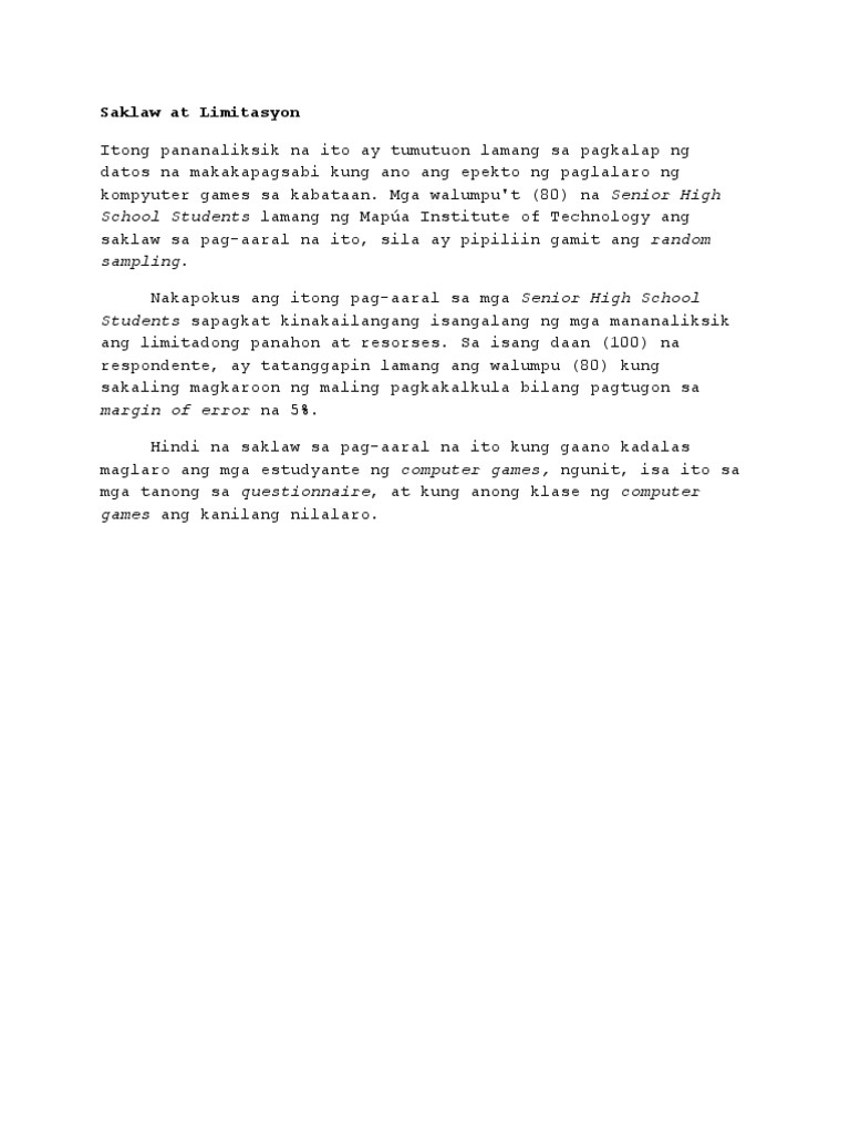 Saklaw at limitasyon ng pag aaral filipino Essays and Research Papers. Ang ibig sabihin ng saklaw at limitasyon ay ang mga terminong tumutukoy sa kung ano ang sakop ng isang pagsasaliksik. Nakapaloob sa pananaliksik na ito ang epektong sikolohikal ng panonod ng teleseryeng romantiko sa kabataang lalaki at babae ng mga mag-aaral ng Politeknikong Unibersidad ng Pilipinas.