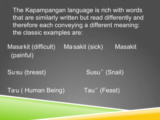 Contents 1 Overview 2 Culture and cuisine. That this by any means captures the whole Kapampangan lexiconItisnecessarytoemphasizethisbecauseoneofthe legacies of the Philippines two colonial periods is the notiondiscreditedanddiscardedlongagobylinguistsbutstill popularlyheldthatlanguagessuchasKapampanganareim. Or Kapampangan It is one of the major languages in the Phlippines.