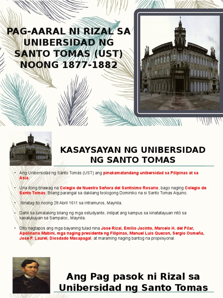 Prezi 2015 Pagkatapos mag-aral ni Rizal sa Ateneo ay nag-aral siya sa UST sa kursong Pre-Law na mas kilalang Metaphysics dahil gusto ito ng kanyang ama. Ang nasabing pari ang humikayat kay Rizal para mag-aral na mabuti lalo na sa pagsulat ng mga tula. Hindi maganda ang pagtingin sa kanya ng mga Dominikong propesor.