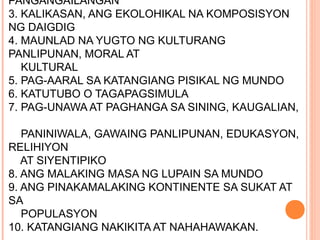 Ano ang isa sa mga sangay ng agham panlipunan na tumutukoy sa siyentipikong pag-aaral sa katangiang pisikal ng daigdig. Ang mga kaalaman at mga gawaing sa modyul na ito ay makakatulong upang higit mong mapahalagahan ang mga pangunahing pangyayaring naganap sa daigdig sa ibat ibang lugar sa pagdaraan ng panahon. Katangiang pisikal ng daigdig by john1lester-1.